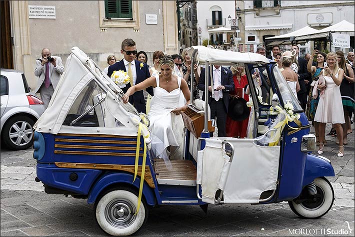 Laura and Theo chose a romantic Italian style Ape car (tuk-tuk) wedding decorated to take them to wonderful wedding venue they choose for their country wedding in Salento.