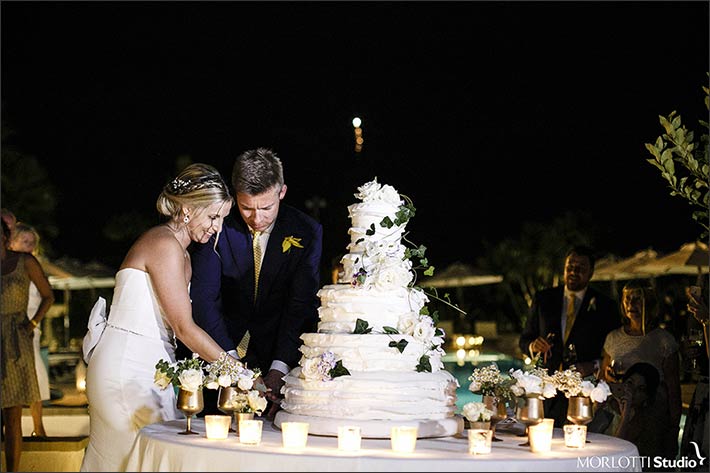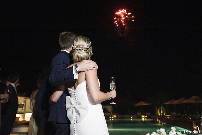 After traditional speeches and a lot of dances throughout wedding meal, wedding cake cut moment came. We planned it by the swimming pool of the country resort. Guests were also surprised by a fantastic firework show! Then dances could keep on going until dawn.