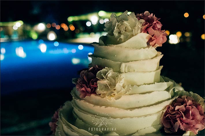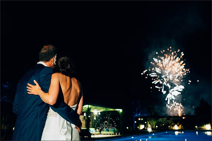 Right after some speeches a scenic wedding cake was served by castle swimming pool. Guests lit sparkles for all and the whole group enjoyed spectacular fireworks over Salento Countryside.