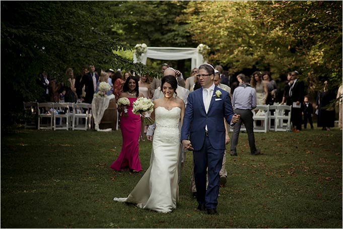 Lovely huppah was set at the end of a garden by two big trees in a very romantic setting.