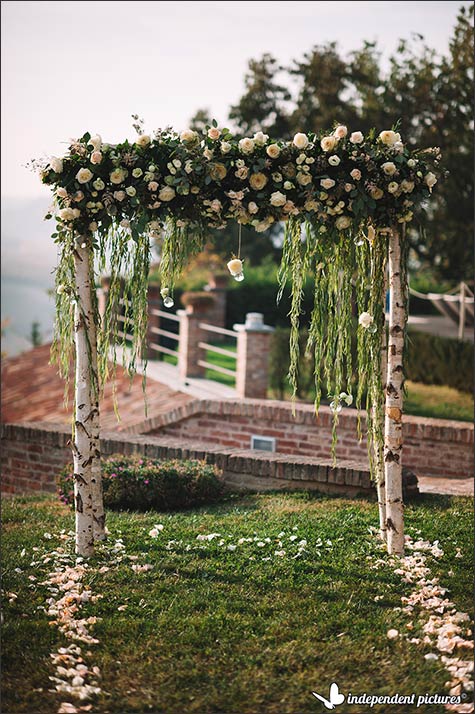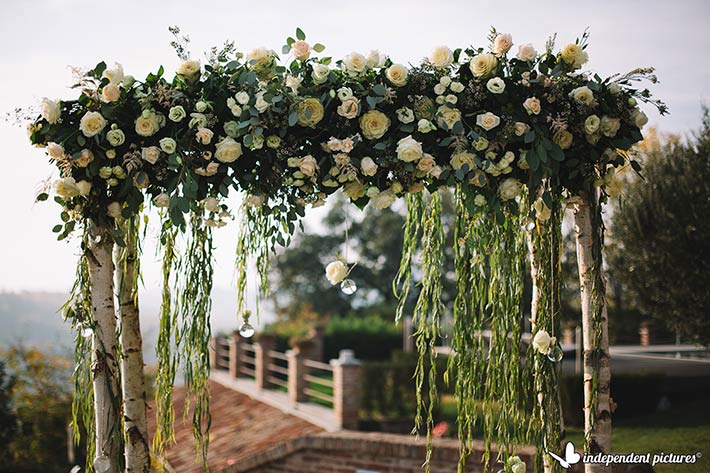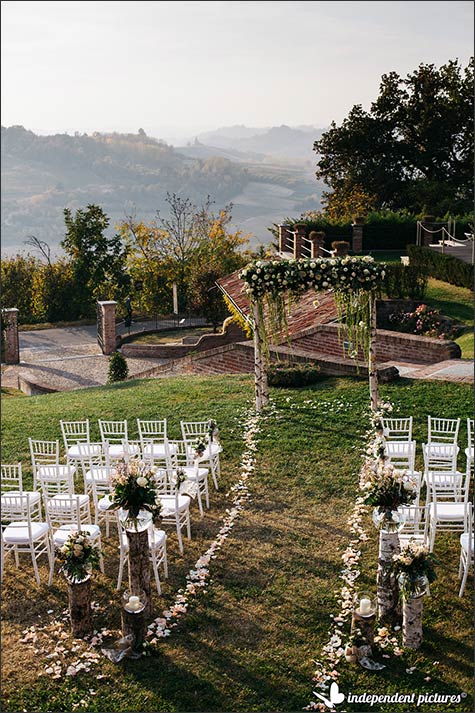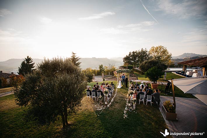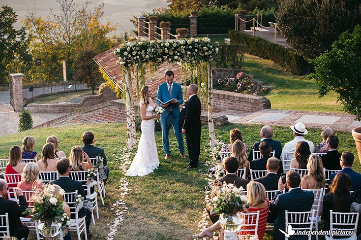 Outdoor wedding ceremony was performed in the garden in front of the Resort overlooking Langhe vineyards hills. Lindsey and Blake exchanged their wedding vows in the light of sunset on the sound a string duo under a romantic floral arch.