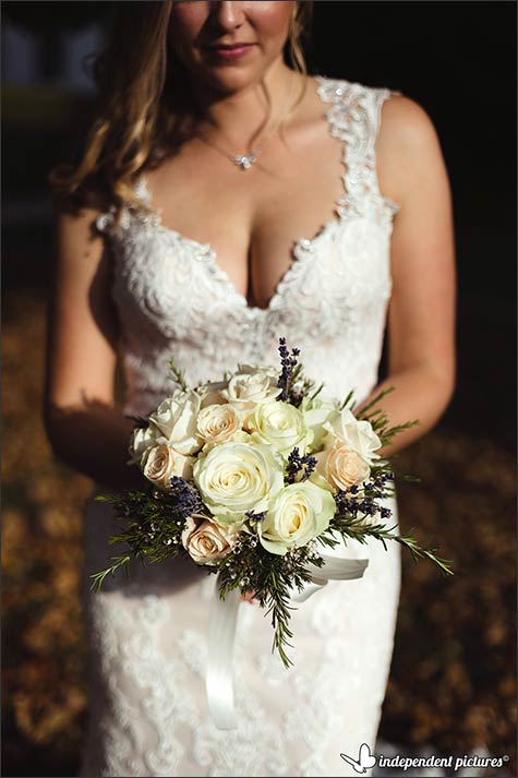 Lindsey chose a natura and smooth style for her wedding flowers in the shads of white and light pink with much foliage.