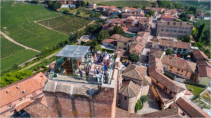 Guests and Mikael reached the tower before while Laura arrived a little after with a car. Panoramic lift took her on top of the tower and ceremony with Langhe view could begin.