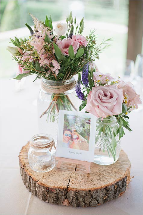 Boho -chic floral centrepieces with maison jars and wooden details. For their wedding stationary Marie-Julie followed boho-chic style with a very pretty floral design.