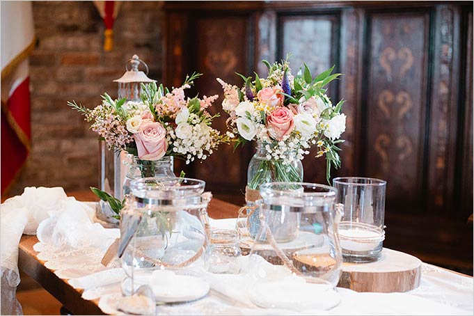Decorations on the ceremony table were planned with the same boho-chic style with maison jars, laces, hessian ribbons and lots of wooden details.