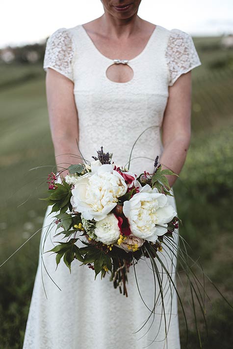 Anne wore a simple wedding dress with a smooth country chic style bridal bouquet with greenery and white roses. โจIt was the perfect mach for a country and a romantic elope in Langhe vineyards.