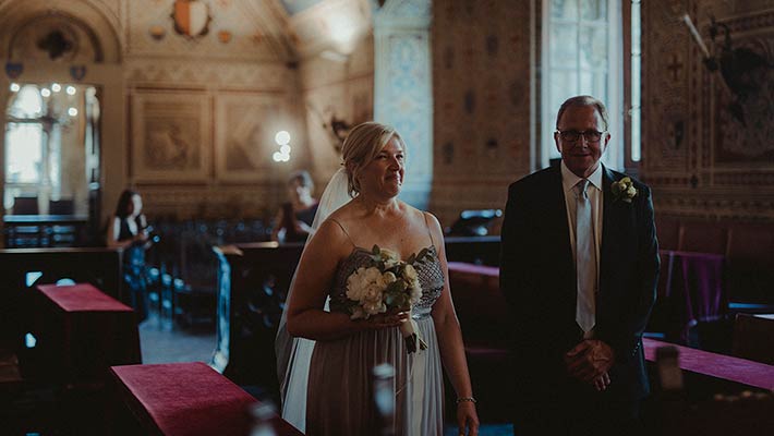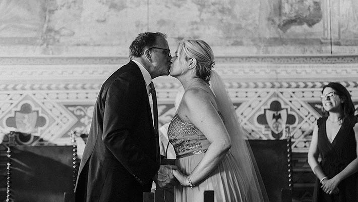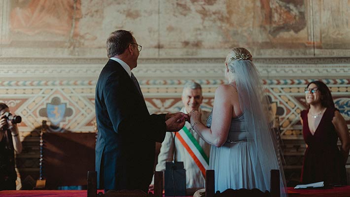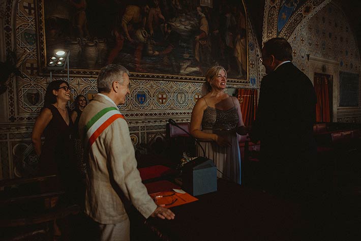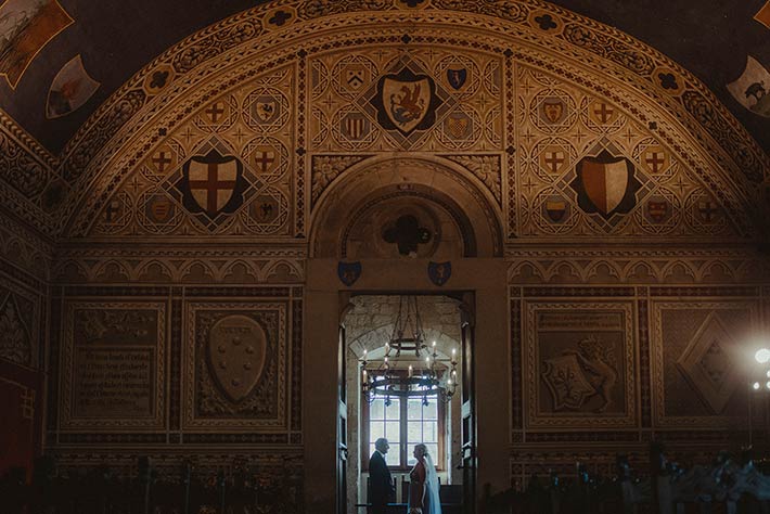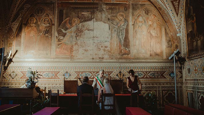 The room for the celebration of civil wedding ceremonies is called Sala del Maggior Consiglio and it can accommodate about 90 people. In this case it hosted a small wedding: a romantic elope in Tuscany.
