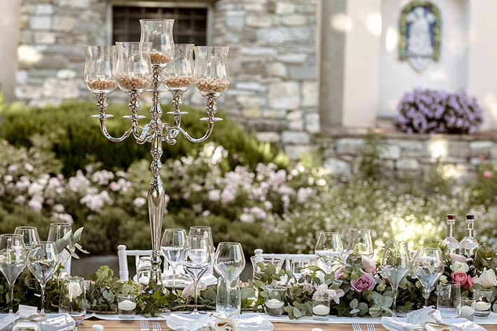At dinner time we invited all guests on the main terrace where a long table was waiting from them. Wedding decors were made with a long floral runner made of green leaves, garden flowers in pink, cream and green and lots of candles.