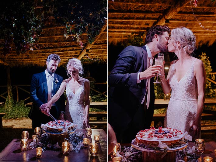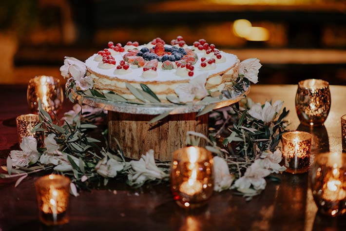 We planned the cutting of the cake on the terrace overlooking Tuscan hills. The cake was an Italian millefeuille filled with wild berries. It was decorated with ivy, flowers and gold candles.
