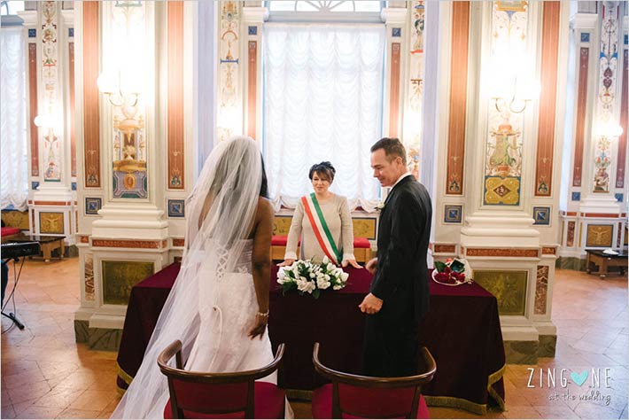 Our couple decided to celebrate their wedding ceremony inside Teatro Mancinelli, the city theatre, inside its decorated XVIII century foyer on the noble floor, in front of the Official of the Town Hall, two witnesses and the parents of the groom only.