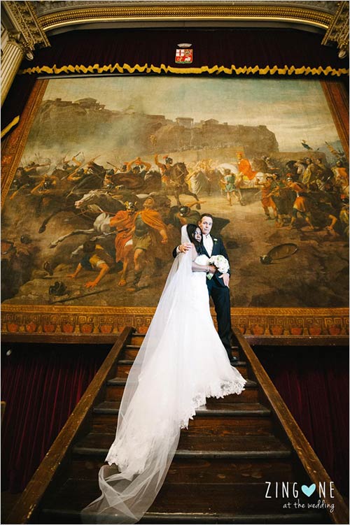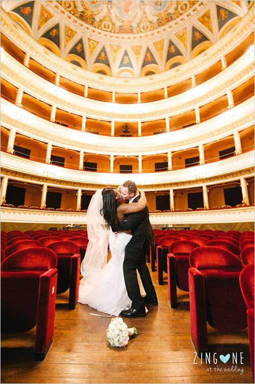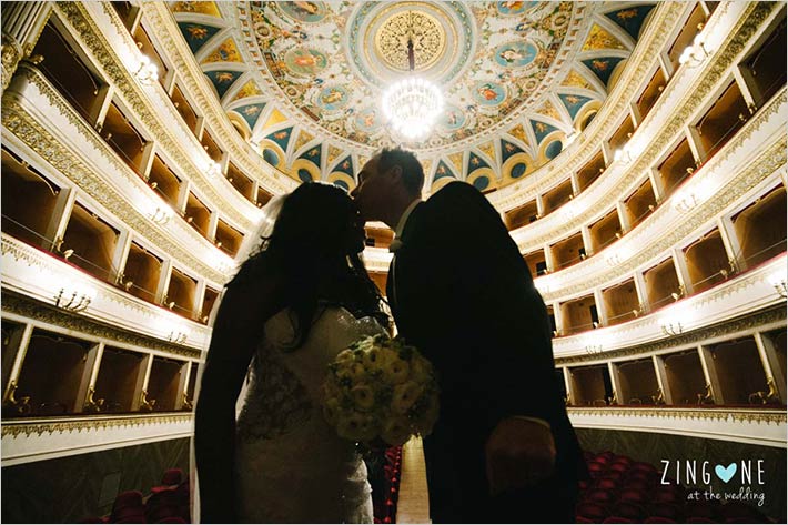 Right after the official part, bride and groom received congratulations and they cut a small wedding cake. They also had a lovely wedding toast with sparking Italian prosecco and took the chance to have some beautiful wedding photo in the hall, stage and audience of the theatre. Just imagine how it would be to have a theatre all for you for one day! on your wedding day, in your wonderful wedding dress!