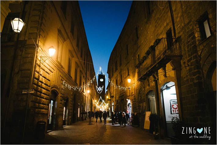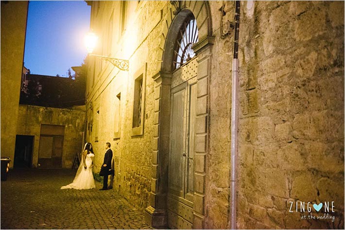 The venue is a 4 star hotel with a delicious traditional restaurant inside the ruins of an ancient abbey. Its interiors still preserves precious frescoes and mosaics and a consecrated church. The two symbols of this mystical place are the great tower and the lonely arch, still standing from the nave collapsing, that frames the city of Orvieto. Such a beautiful scenery for a wedding dinner and take some more pictures!
