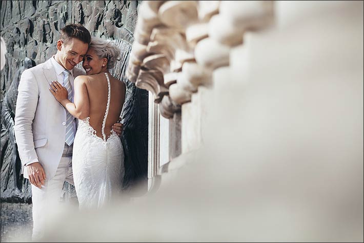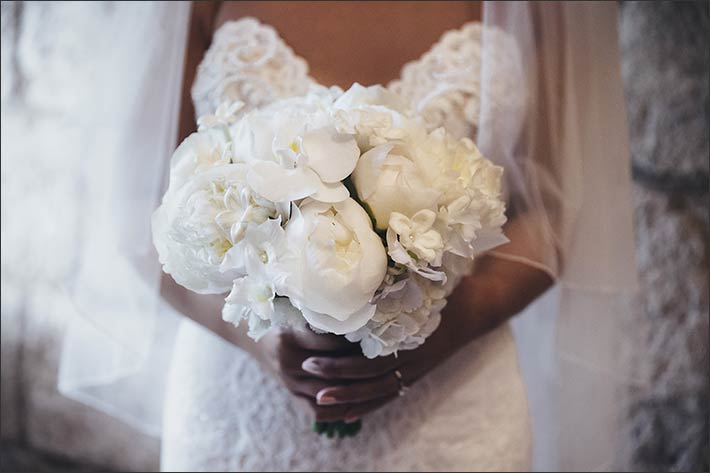 They opted for a symbolic wedding ceremony, surrounded by their relatives, in the former refectory of the abbey under a beautiful fresco. Decorations inside the room was sober, all in with white peonies and gypsophila, matching with Kimโs bouquet made of total all white peonies. The ceremony was simple yet very emotional for bride and groom.