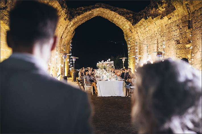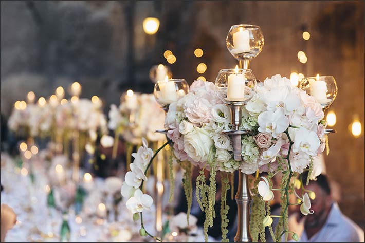 Just Married couple came back later, had a change of outfit and they gave appointment to their friend for the wedding dinner. It was set in the stunning frame of abbey ruins. It was lightened by many candles and rows of fairy lights and bulbs falling from the walls creating a nice perspective around the table. Wedding floral arrangements were rich and sumptuous. They were all made with peonies in the shades of pink and white. Silver high candelabras and porcelain small vases all over the long imperial table did the rest. A powerful, surreal and romantic set up.
