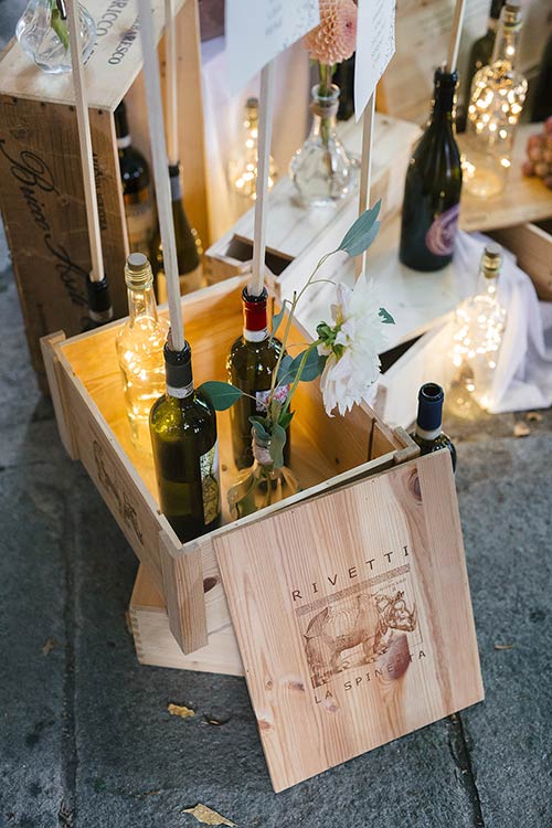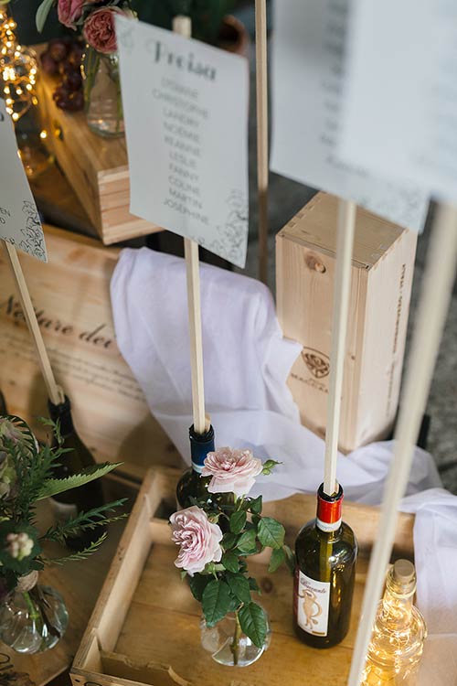 A 3D table chart made of wine boxes, bottles, fairy lights and signs with the names of the tables and names of the guests. Everybody loved it! We did too.