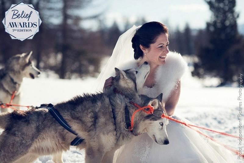 Clare and Rob took the chance to take some stunning pictures in the snowโฆ. they could not miss the opportunity with such a great day! Some steps in the snow and, most of all, sweet pictures with sleigh dogs. We can say that this is the essence of a Winter Wedding in the Italian Alps.